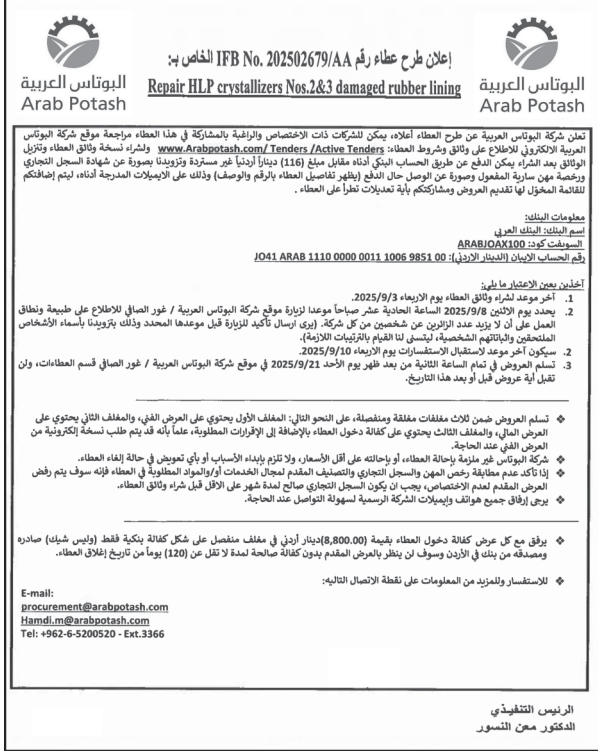 عطاء صادر عن شركة البوتاس العربية