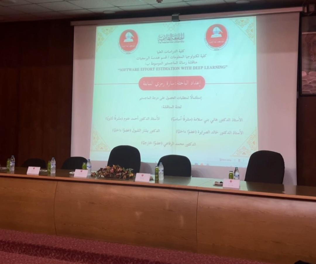 عمون - شهدت الجامعة الهاشمية مناقشة رسالة الماجستير للطالبة سارة رمزي النبابتة في تخصص هندسة البرمجيات يوم الأحد ٢٤-٨-٢٠١٥، وذلك بحضور لجنة المناقشة التي تألفت من: