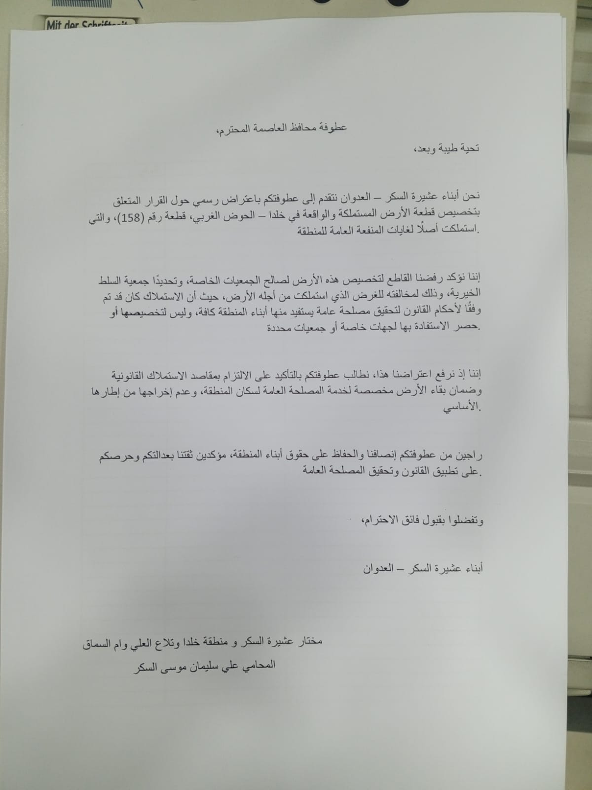 ورفع الكتاب المتضمن الشكوى مختار عشيرة السكر المحامي علي موسى السكر.
