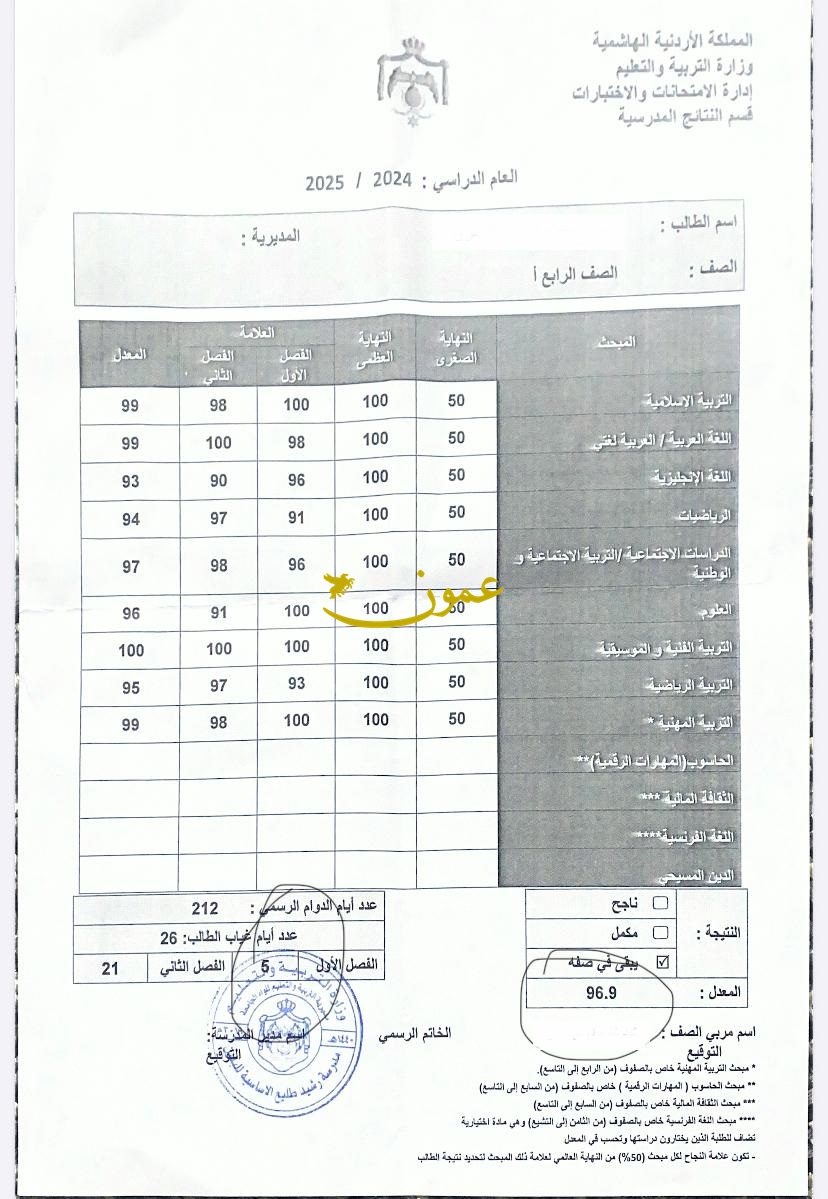 الطالب وفق ما هو مقيد على شهادته المدرسية التي اطلعت عليها عمون، تغيب 21 يوما عن الدوام في الفصل الدراسي الثاني، فيما تسمح قوانين وزارة التربية بغياب 20 يوما فقط، ما أدى إلى عدم ترفيعه للصف التالي والابقاء عليه في صفه.