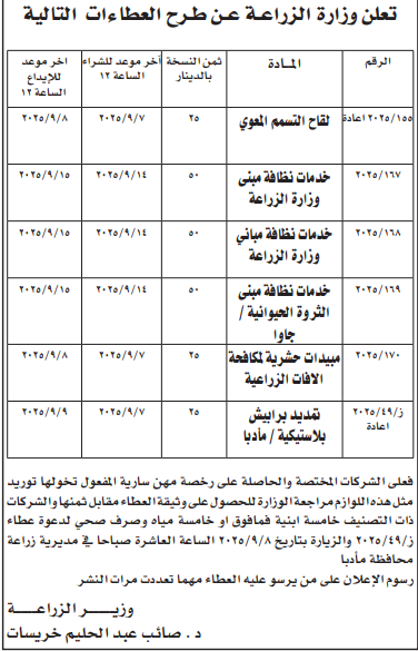 عطاءات صادرة عن وزارة الزراعة