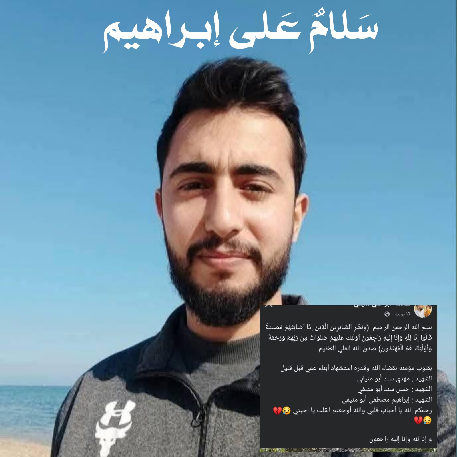 عمون - ينعى بلال أبو السمن وفاة صديقه إبراهيم مصطفى أبو منيفي، الذي إرتقى شهيدا مع عدد من أقربائه بتاريخ 16 تموز 2025 بعد قصف اسرائيلي بالقرب من جامع مالك بن أنس في شارع ابو عريف في مدينة دير البلح بقطاع غزة.