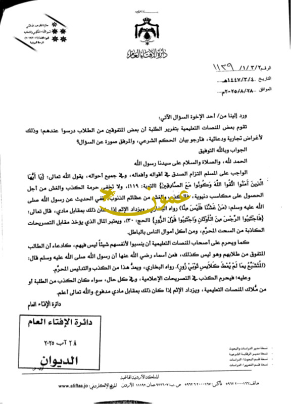 عمون - أكدت دائرة الإفتاء العام أن الكذب في التصريحات الإعلامية، خاصة تلك المتعلقة بالمنصات التعليمية، هو أمر محرّم شرعًا.