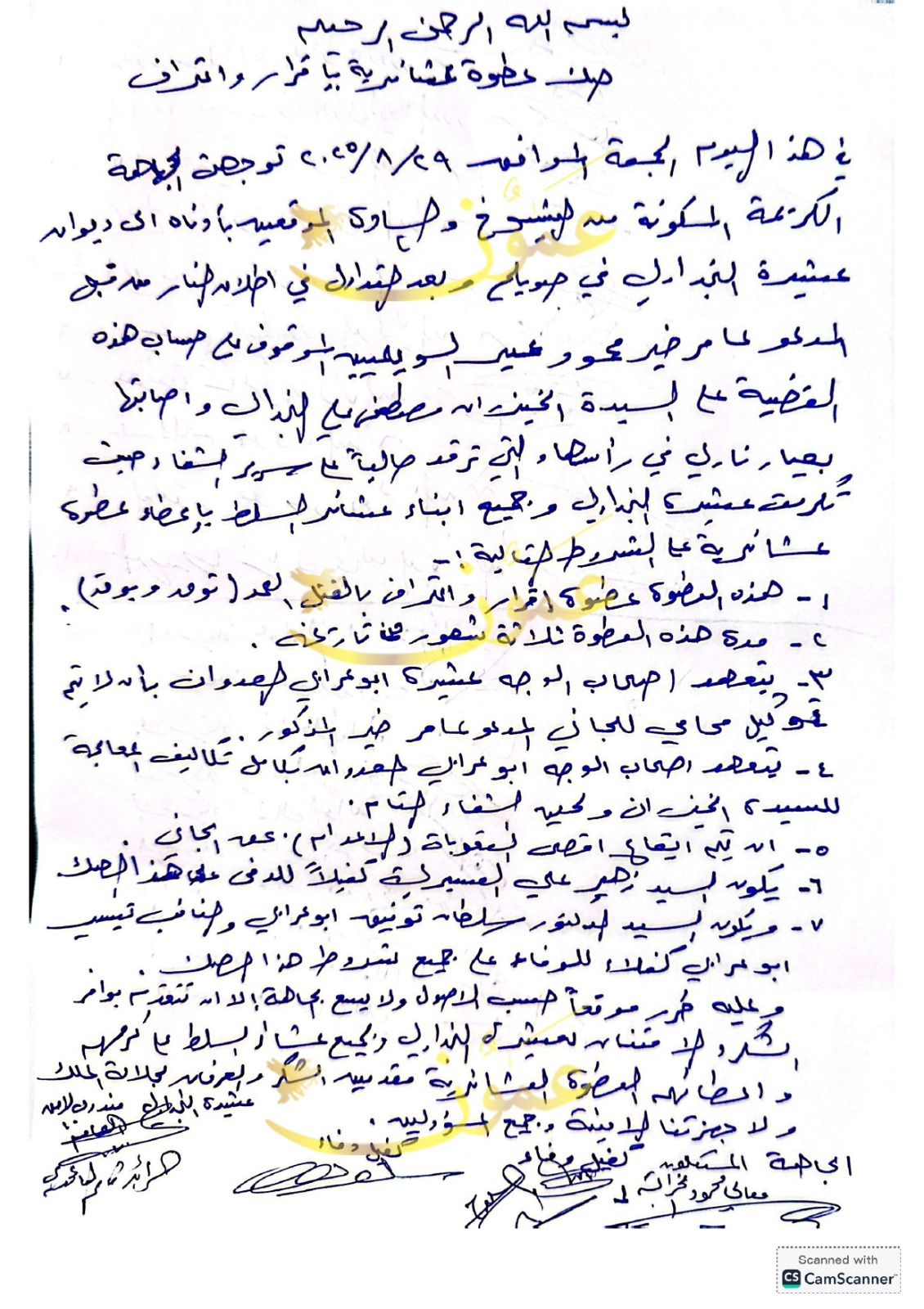 يتعهد أصحاب الوجه (عشيرة أبو عرابي والعدوان) بأنه لن يتم توكيل محامٍ للجاني المدعو عامر خير المذكور.