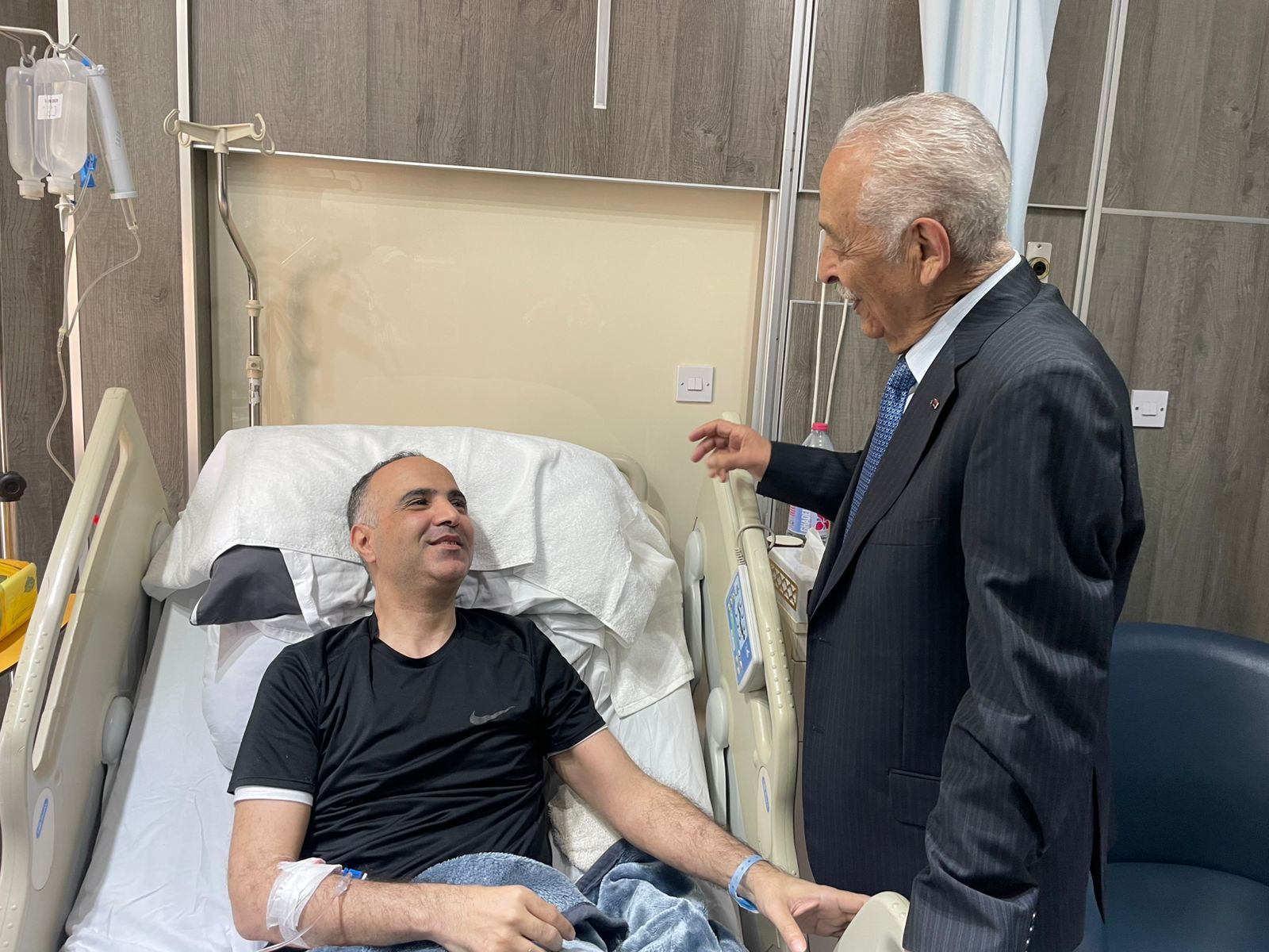 عمون - مندوبًا عن جلالة الملك عبدالله الثاني ابن الحسين وولي عهده الأمين، قام رئيس الديوان الملكي الهاشمي، يوسف العيسوي، اليوم، بزيارة إلى النائب السابق شادي فريج، الذي يرقد على سرير الشفاء، للاطمئنان على صحته ومتابعة حالته الصحية. |