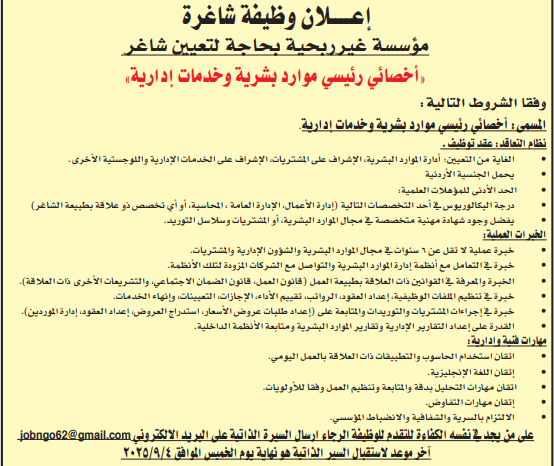مطلوب أخصائي موارد بشرية وخدمات ادارية