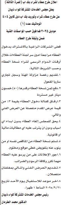 عطاء شراء بك اب دبل كابين 4×4 لمجلس الخدمات المشتركة للواء ذيبان