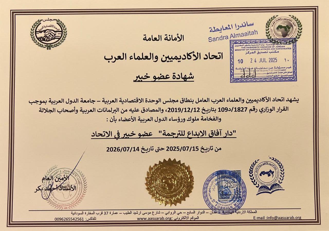 دار آفاق الابداع للترجمة تنضم رسميًا كعضو خبير في اتحاد الأكاديميين والعلماء العرب