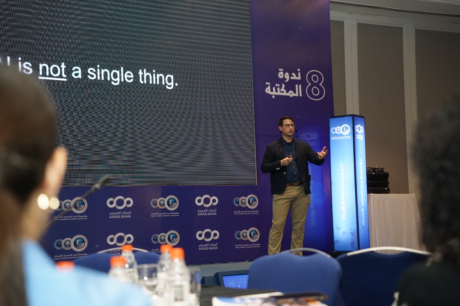 الرئيسة التنفيذية للمؤسسة فالنتينا قسيسية، قالت في بداية الحوارية، إن مؤسسة عبد الحميد شومان – الذراع الثقافي والاجتماعي للبنك العربي، دأبت منذ عام 2016، على تنظيم هذه الندوة سنويا لتكون مساحة للتفكير في مستقبل المكتبات، مشيرة إلى أنه في كل ندوة يتم طرح قضية جديدة تعكس التحديات التي نعيشها وتفتح أمامنا آفاقا للتغيير. وأضافت "اليوم، في النسخة الثامنة، نطرح سؤالا جوهريا بات في قلب النقاش العالمي: كيف يمكن للتكنولوجيا العميقة والذكاء الاصطناعي والروبوتات أن تعيد رسم صورة المكتبة؟ ليس فقط كمراكز لحفظ المعرفة، بل كمحركات للتغيير والابداع والابتكار في خدمة المجتمعات".