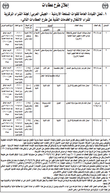 عطاءات صادرة عن القيادة العامة للقوات المسلحة الاردنية