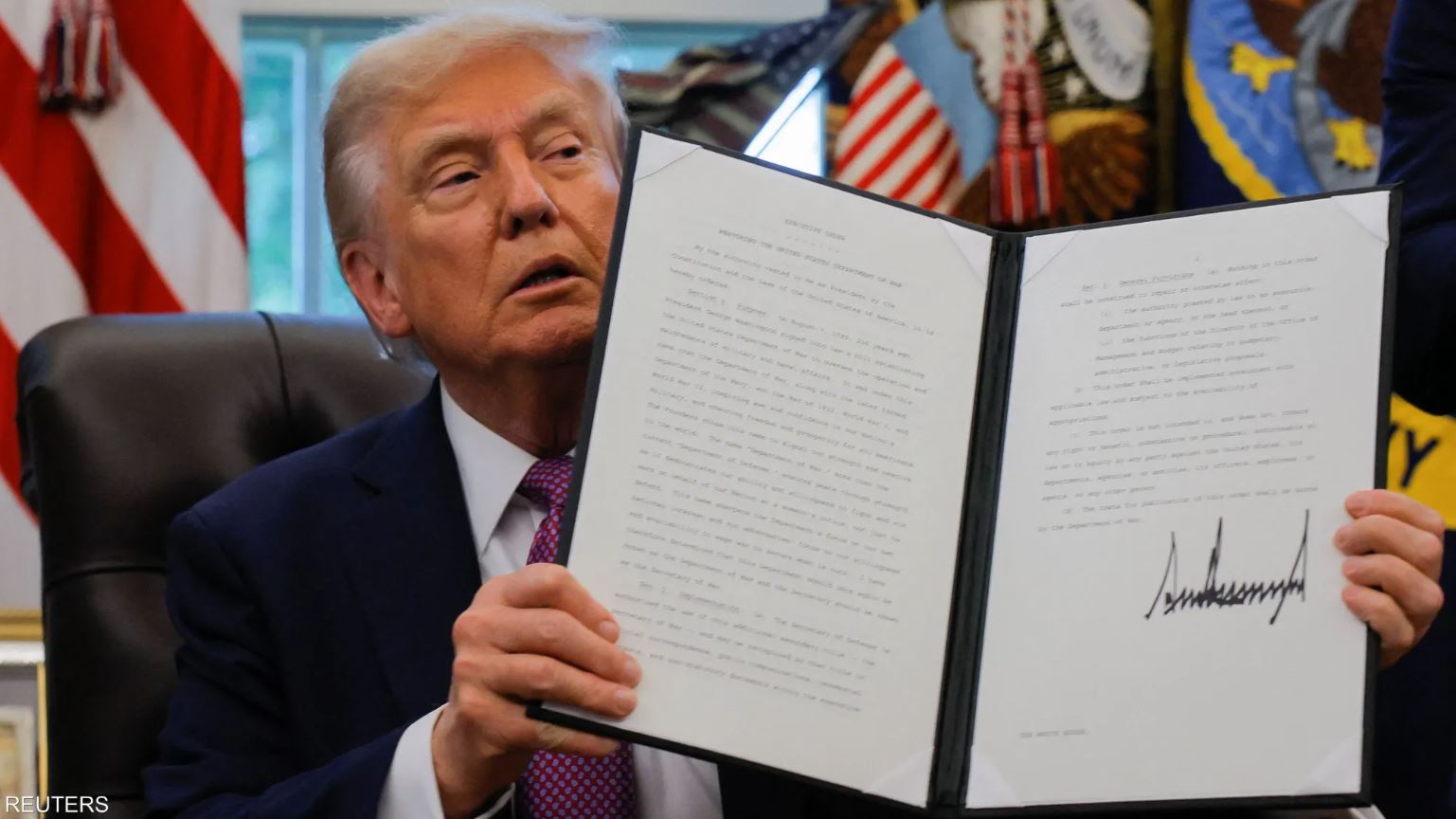 فقد وقع ترامب، الجمعة، أمرا تنفيذيا بتغيير تسمية وزارة الدفاع إلى "وزارة الحرب"، وقال للصحفيين في البيت الأبيض بحضور وزير "الحرب" بيت هيغسيث، إن الاسم الجديد "أكثر ملاءمة في ضوء وضع العالم راهنا"، مضيفا أنه "يبعث رسالة النصر" إلى العالم.