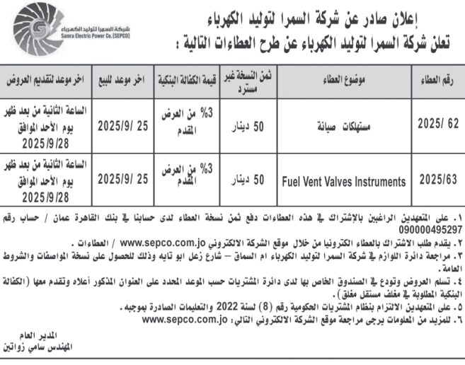 عطاءات صادرة عن شركة السمرا لتوليد الكهرباء
