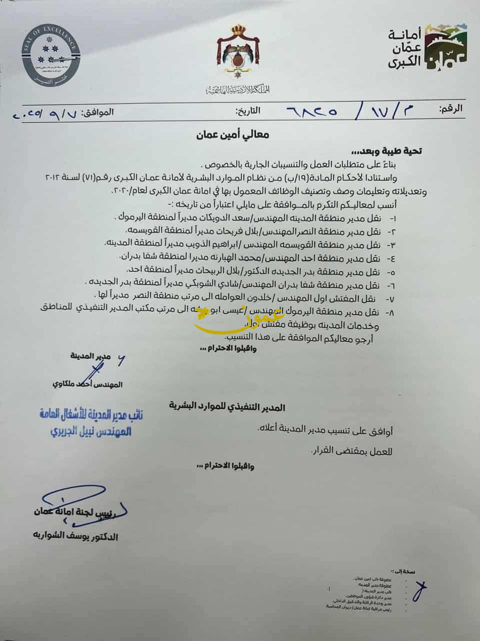 تنقلات لمدراء مناطق في أمانة عمان (أسماء)