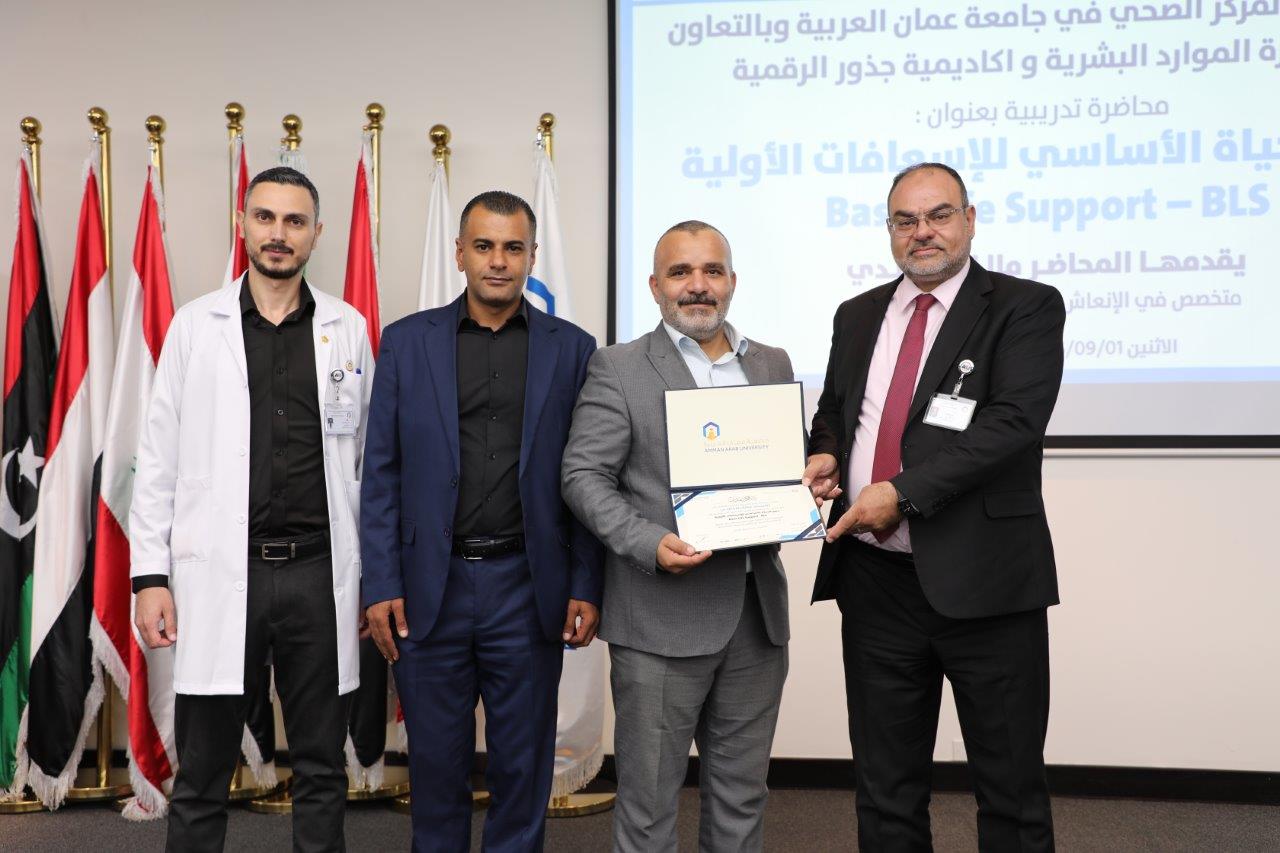 عمون - نظم المركز الصحي بالشراكة مع دائرة الموارد البشرية في جامعة عمان العربية وبالتعاون مع أكاديمية جذور الرقمية، محاضرة تدريبية بعنوان""دعم الحياة الأساسي للإسعافات الأولية – Basic Life Support (BLS)"، قدمها الأستاذ مالك الخالدي المتخصص في الإنعاش القلبي الرئوي، ومدير المركز التدريبي في نقابة الممرضين وعضو اللجنة الوطنية لتطوير المهن في المجلس الصحي العالي، وبحضور الأستاذ الدكتور إسماعيل يامين مساعد الرئيس للشؤون الأكاديمية مندوباً عن الأستاذ الدكتور محمد الوديان رئيس جامعة عمان العربية، والأستاذ محمد البستنجي ممثلاً عن أكاديمية جذور الرقمية وعدد من أعضاء الهيئتين التدريسية والإدارية والطلبة في الجامعة.