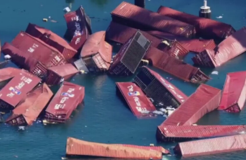 ومن بين الحاويات التي سقطت، انقلبت بعضها على مؤخرة السفينة بينما سقطت أخرى على بارجة صغيرة مجاورة مخصصة لتنقية الهواء.