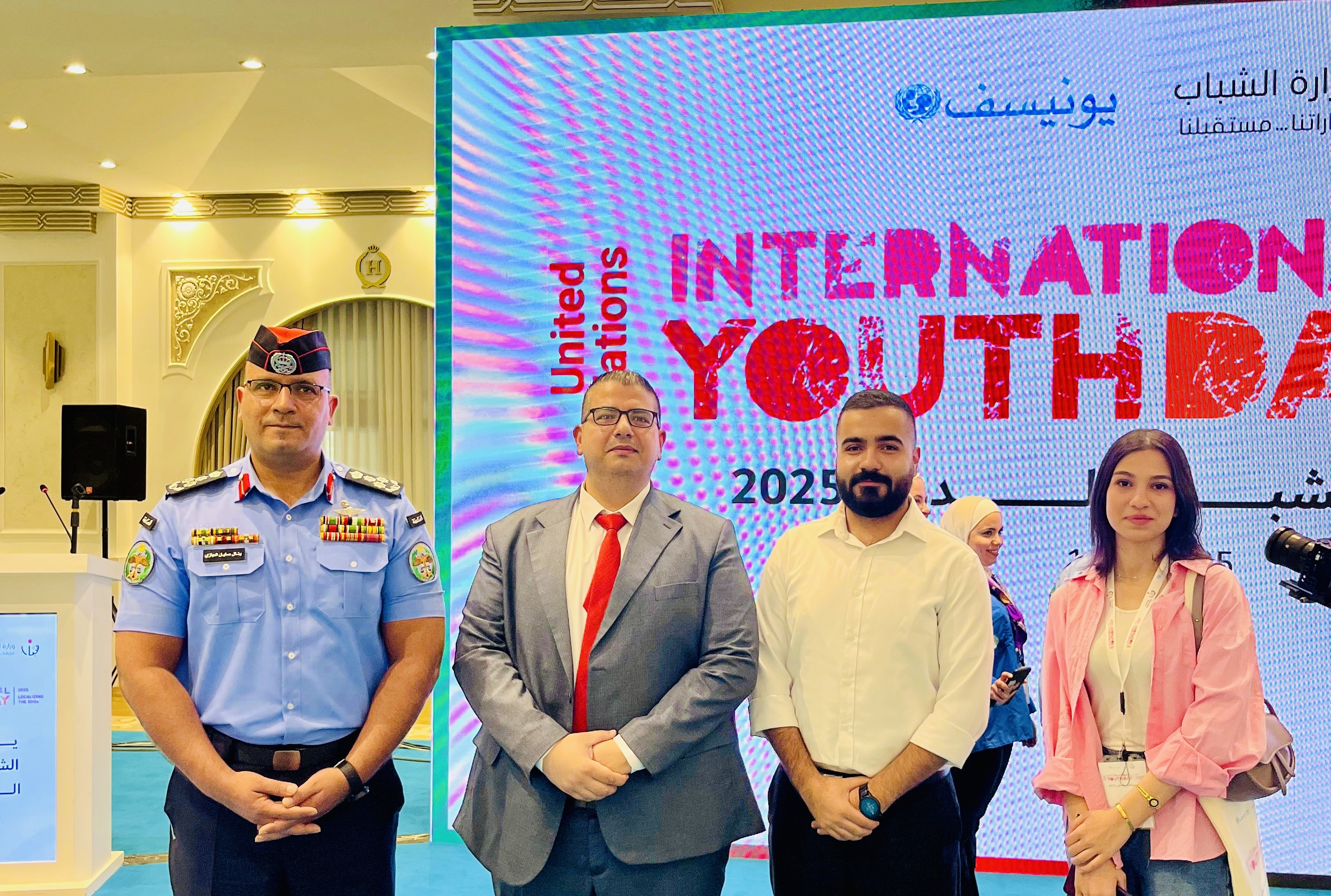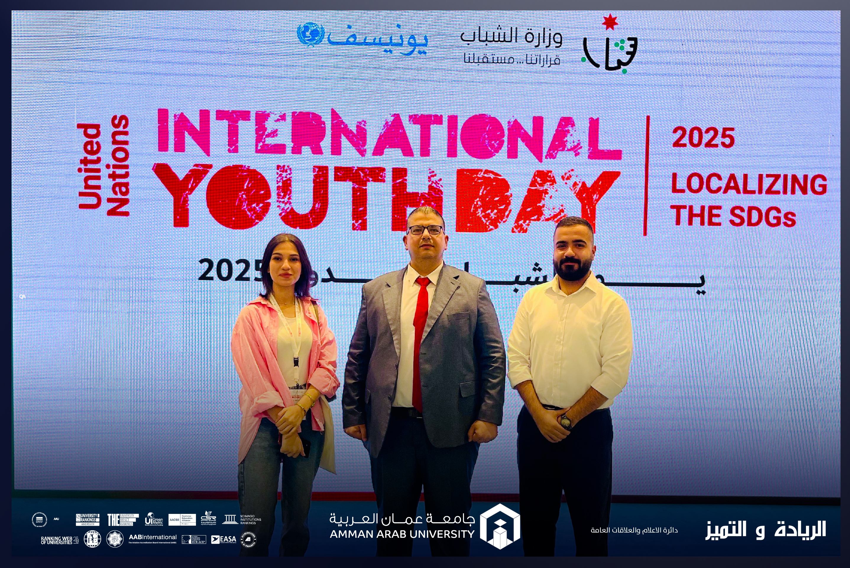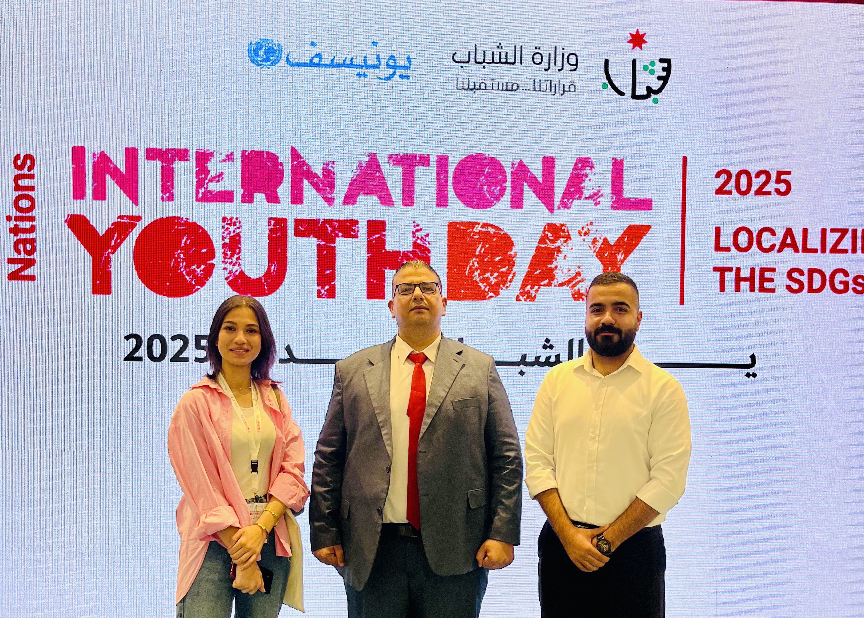 عمون - انطلاقاً من حرص جامعة عمان العربية على دعم الطلبة وتنمية قدراتهم، وبتوجيه من الأستاذ الدكتور محمد الوديان رئيس الجامعة شاركت عمادة شؤون الطلبة في احتفالية اليوم العالمي للشباب، وذلك برعاية معالي وزير الشباب الدكتور رائد العدوان، والتي أقيمت في قاعة عمّان الكبرى – مدينة الحسين للشباب بتنظيم من وزارة الشباب ومنظمة اليونيسف، وبحضور ممثلين عن المؤسسات الحكومية والخاصة والمنظمات الدولية، إضافة إلى مشاركة واسعة من شباب وشابات المملكة الأردنية الهاشمية.