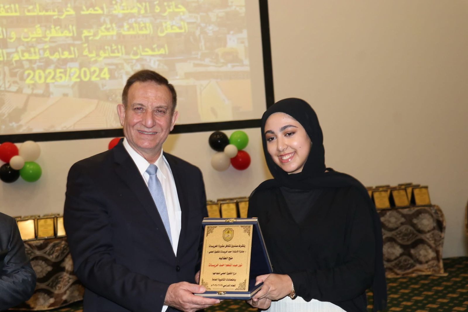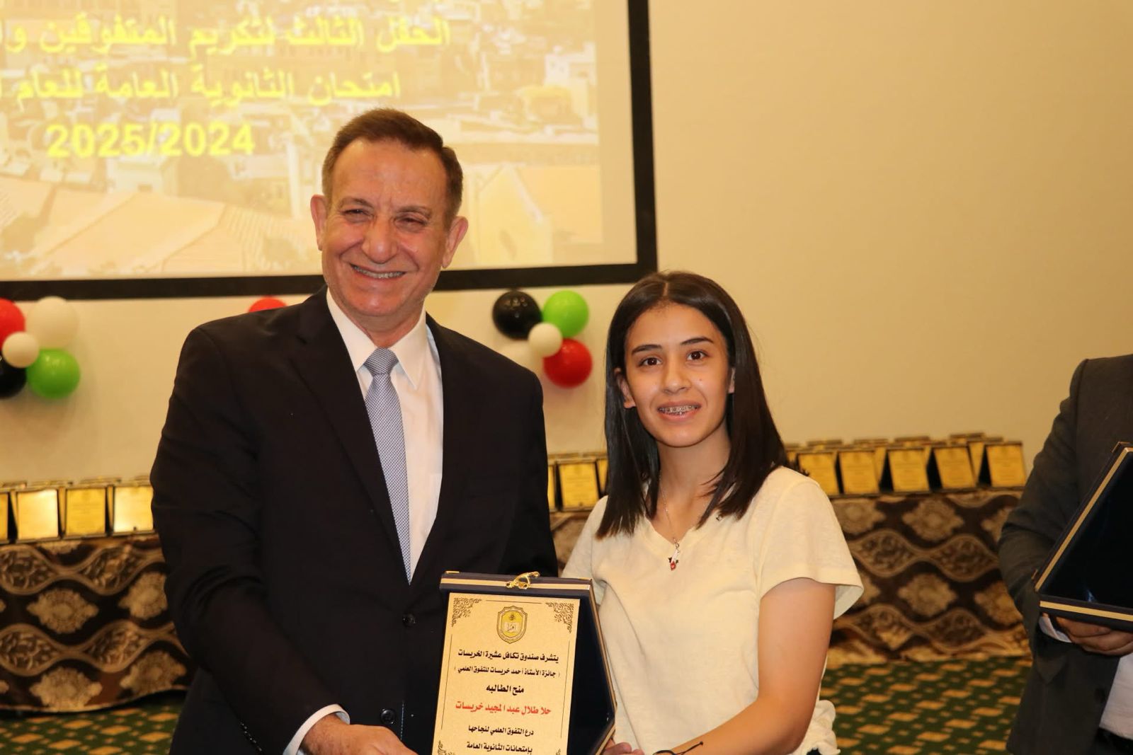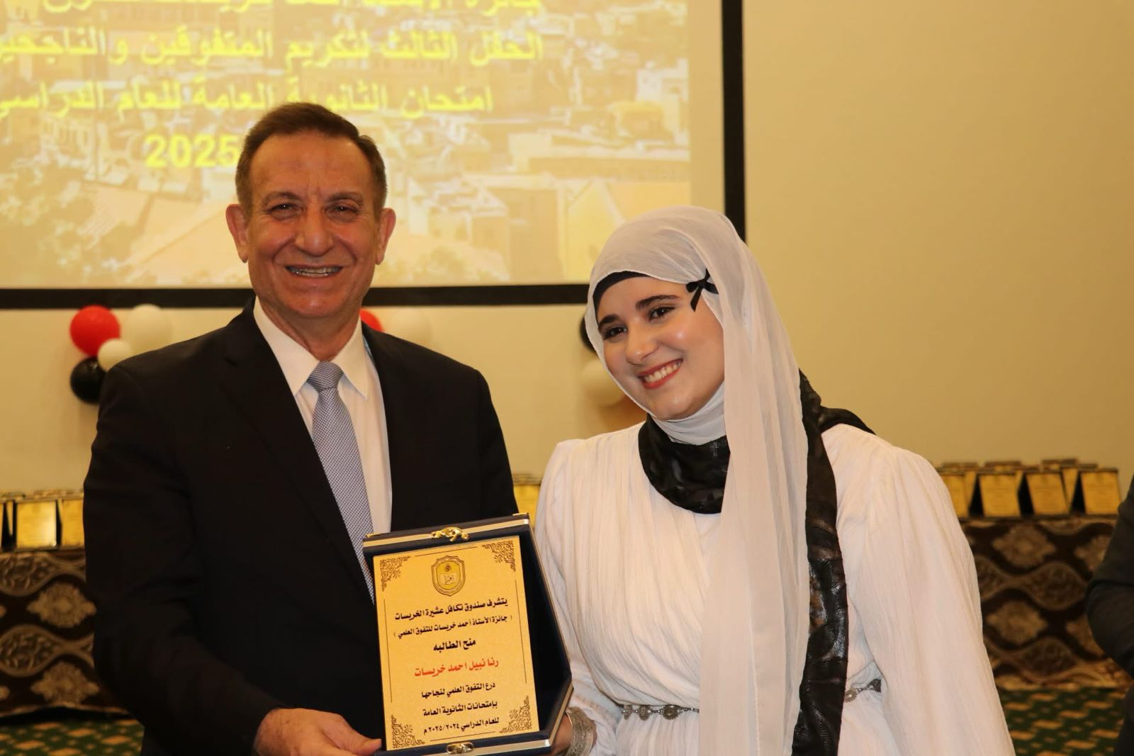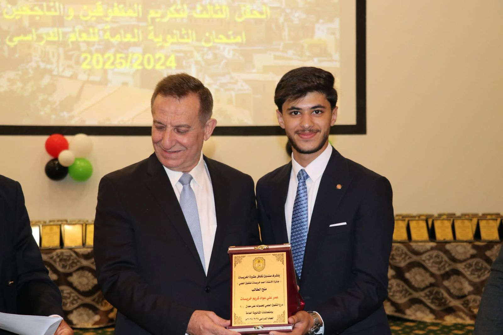 وألقى الطالب يوسف عبد الحميد خريسات، الحاصل على معدل 98.25 من منطقة تبنة، كلمة باسم زملائه المكرمين عبّر فيها عن امتنانه لهذا التكريم، مؤكداً أن هذا الدعم يشكل دافعاً لمواصلة مسيرة التفوق وخدمة الوطن.