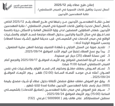 عطاء صادر عن نقابة المهندسين الاردنيين