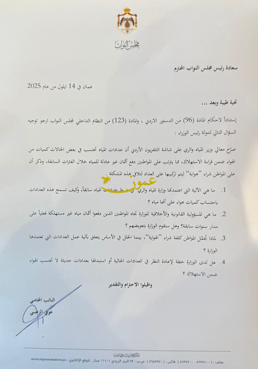 عمون - وجه النائب عوني الزعبي سؤالا نيابيا إلى رئيس الوزراء، حول عدادات المياه بعد إقرار وزير المياه والري بأن العدادات تحتسب في بعض الحالات الهواء ضمن قراءات الاستهلاك. |