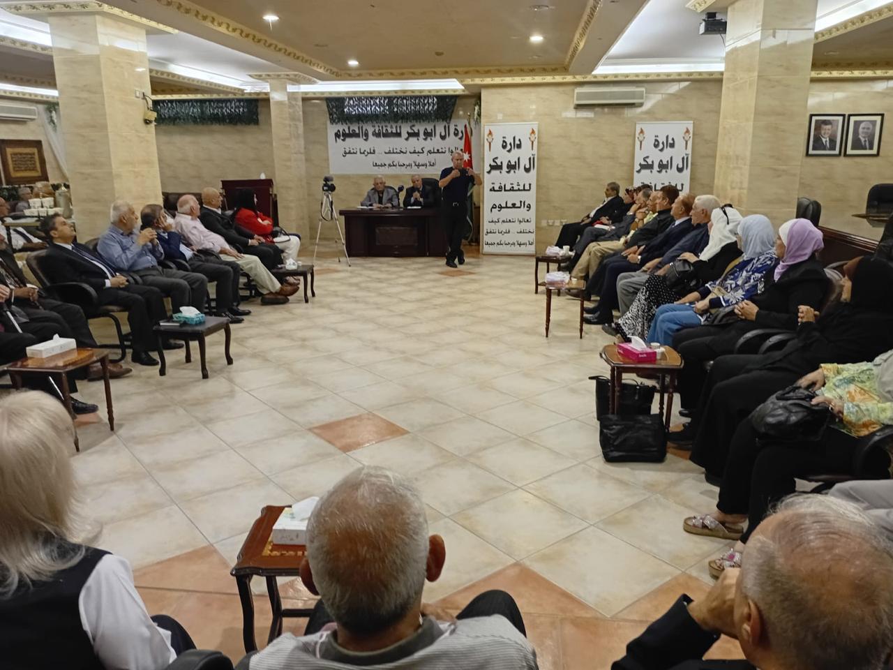 عمون - اقامت دارة آل أبو بكر للثقافة والعلوم ندوتها السادسة والخمسين والتي حملت عنوان :التهديدات الصهيونية للأردن والمنطقة وكيفية المواجهة بحضور حشد كبير من رواد الدارة وأصدقائها والمهتمين".