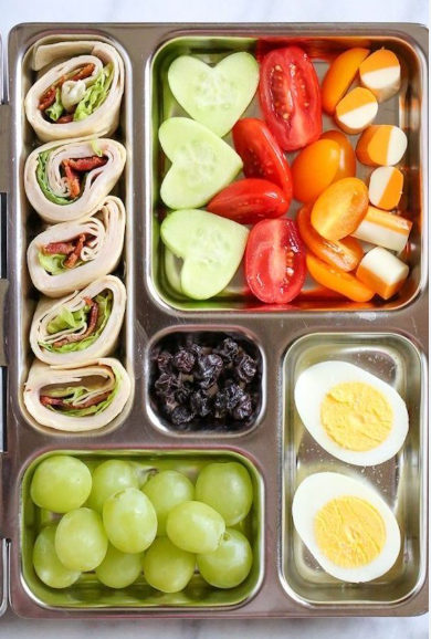 الخضراوات: يُنصح بوضع نوعين على الأقل من الخضراوات، مثل الجزر المقطع إلى أعواد، الخيار، شرائح الفلفل الرومي، أو الطماطم.