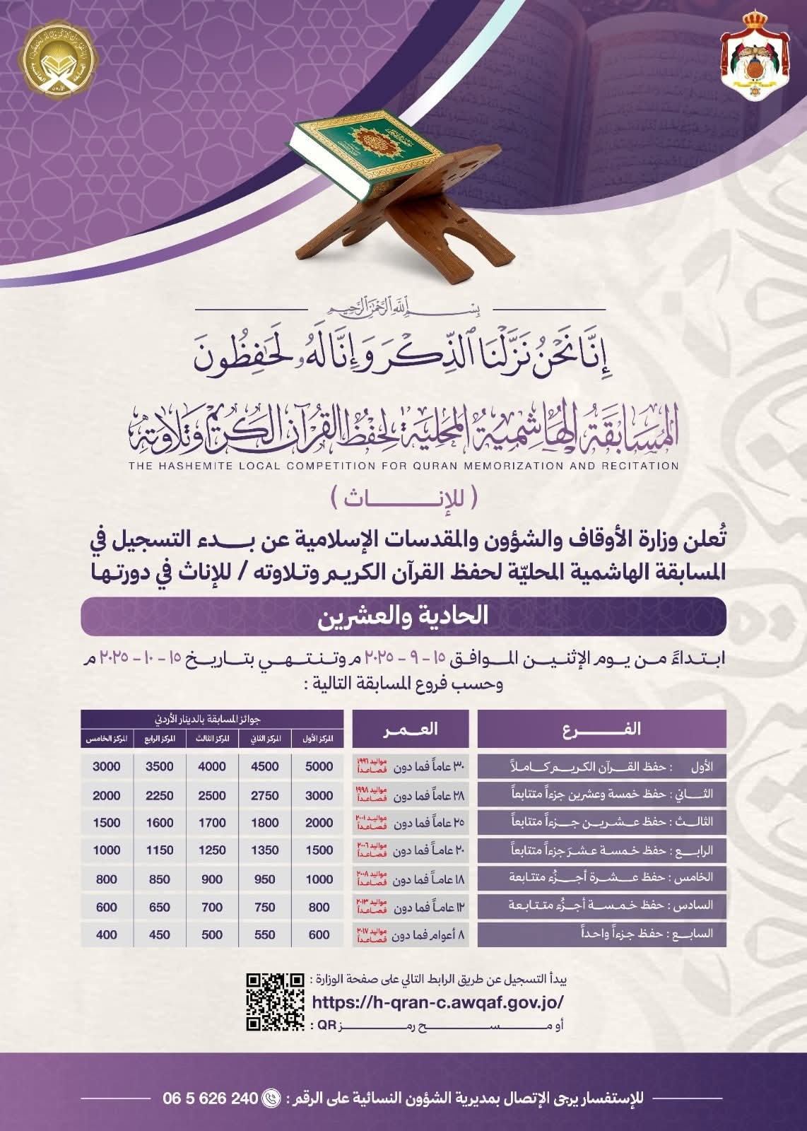 عمون - أعلنت وزارة الأوقاف والشؤون المقدسات الإسلامية، عن بدء التسجيل في المسابقة الهاشمية المحلية للإناث لحفظ القرآن الكريم وتلاوته في دورتها الـ21.