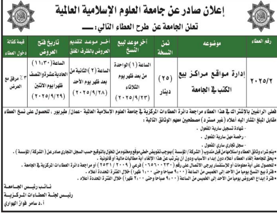 عطاء صادر عن جامعة العلوم الاسلامية العالمية