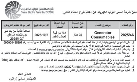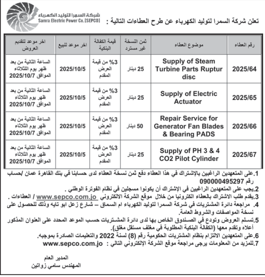 عطاءات صادرة عن شركة السمرا لتوليد الكهرباء