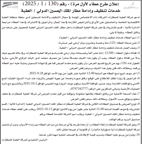 عطاء شراء خدمات التنظيف لمطار الملك الحسين الدولي/ العقبة