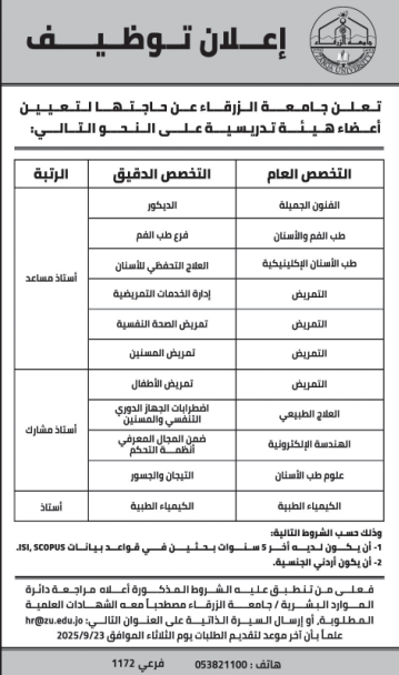 جامعة الزرقاء بحاجة لتعيين اعضاء هيئة تدريسية