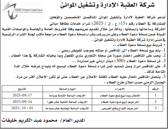 عطاء صادر عن شركة العقبة لادراة وتشغيل الموانئ