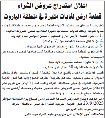 عطاء شراء ارض لغايات المقبرة في منطقة الياروت