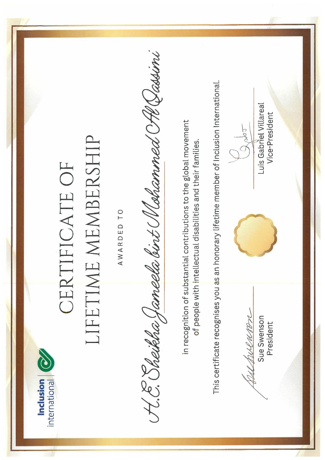 وتمثل هذه الشهادة تكريماً دولياً رفيع المستوى من قبل المنظمة التي تعد أكبر شبكة عالمية تعنى بحقوق الأشخاص ذوي الإعاقة الذهنية وأسرهم، ما يضع الشيخة جميلة القاسمي في مصاف القيادات العالمية التي أثرت بشكل ملموس في دعم حقوق وتمكين الأشخاص ذوي الإعاقة الذهنية على مستوى المجتمع الدولي.