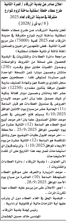عطاء خلطة اسفلتية لشوارع بلدية الزرقاء