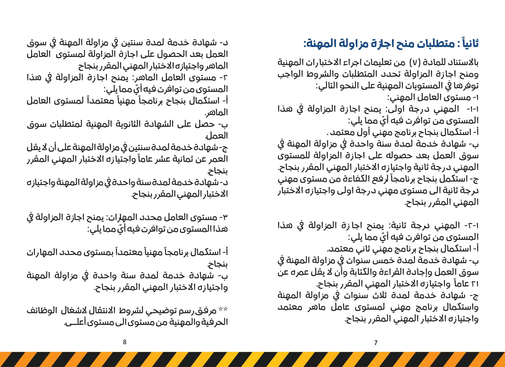 وفيما يتعلق بالمهني درجة ثانية، فإنه يمنح إجازة المزاولة في هذا المستوى اذا استكمل برنامج مهني ثاني معتمد بنجاح، وحصل على شهادة خدمة لمدة سنتين في مزاولة المهنة في سوق العمل والحصول على إجازة المزاولة لمستوى العامل الماهر واجتياز الاختبار المهني، وشهادة خدمة لمدة ثلاث سنوات في مزاولة المهنة واستكمال برنامج مهني لمستوى عامل ماهر معتمد واجتياز الاختبار، وشهادة خدمة لمدة خمس سنوات في مزاولة المهنة في سوق العمل، إضافة إلى اجادة القراءة والكتابة وأن لا يقل عمره عن 21 عاما.