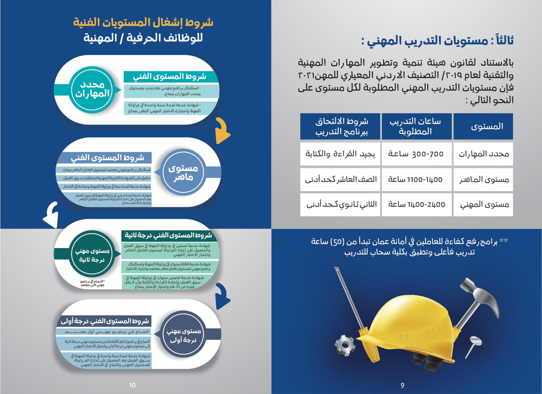 وشدد الشواربة على اهمية التدريب المهني لكافة المستويات بهدف تأهيل الموظفين وتطوير مهاراتهم، حيث يتطلب المستوى المهني 1400-2400 ساعة تدريبية شرط الحصول على شهادة الثاني ثانوي كحد ادنى للالتحاق بالتدريب، بينما يتطلب مستوى الماهر 1100-1400 ساعه تدريبية شرط الحصول على شهادة الصف العاشر كحد أدنى للالتحاق ، فيما يتطلب مستوى محدد المهارات 300-700 ساعه تدريبية شرط ان يجيد القراءة والكتابة.