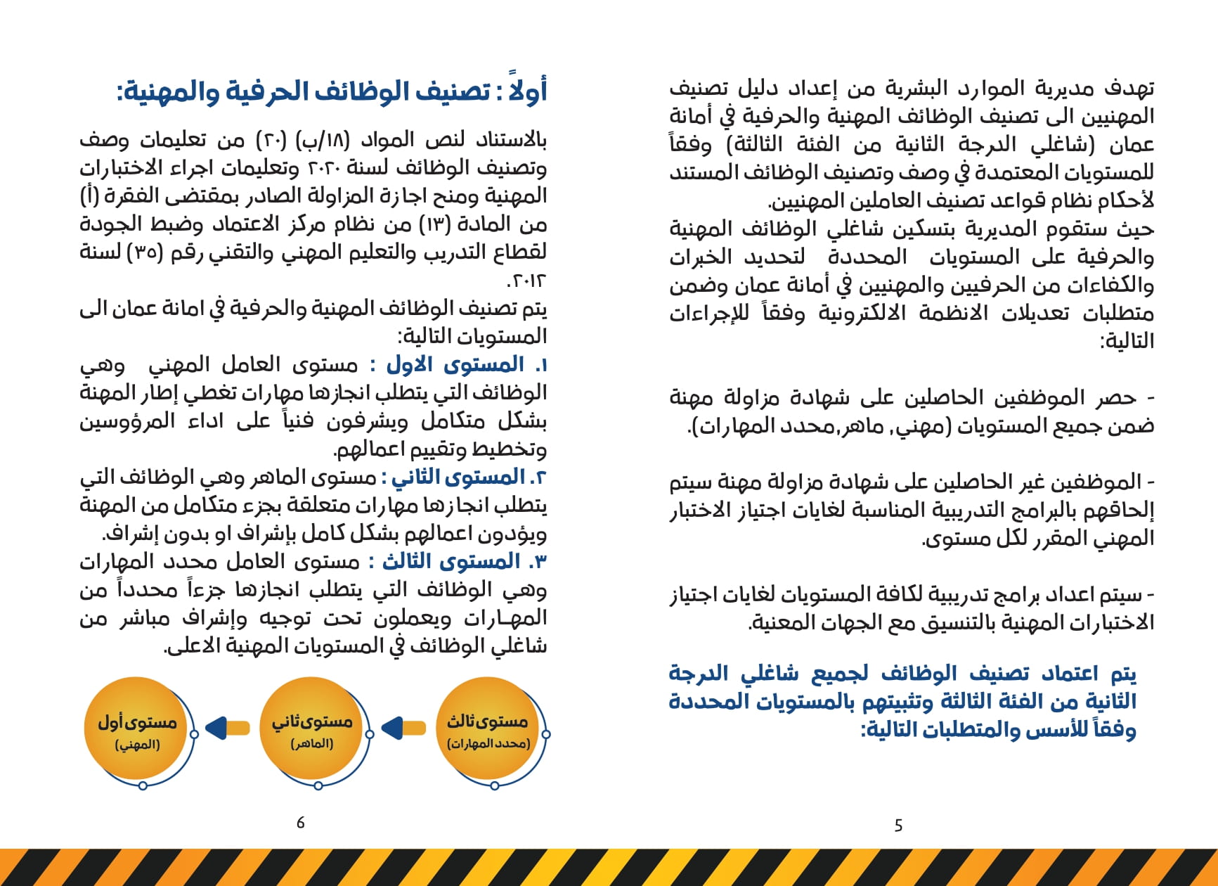 وأوضح الشواربة انه من خلال هذا التصنيف فان الأمانة ستقوم بتسكين شاغلي الوظائف المهنية والحرفية على المستويات المحددة لتحديد الخبرات والكفاءات من الحرفيين والمهنيين في أمانة عمان وضمن متطلبات تعديلات الانظمة الالكترونية من خلال حصر الموظفين الحاصلين على شهادة مزاولة مهنة ضمن جميع المستويات بمهني، و ماهر ومحدد المهارات، بينما سيتم إلحاق الموظفين غير الحاصلين على شهادة مزاولة مهنة بالبرامج التدريبية المناسبة لغايات اجتياز الاختبار المهني المقرر لكل مستوى، كما سيتم إعداد برامج تدريبية لكافة المستويات لغايات اجتياز الاختبارات المهنية بالتنسيق مع الجهات المعنية