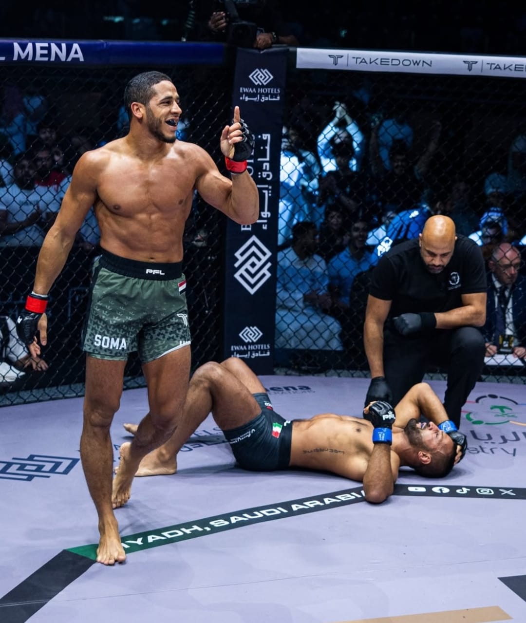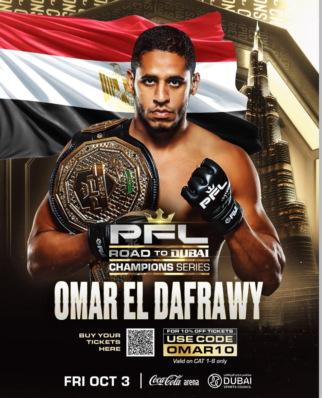 عمون - يشارك المقاتل المصري عمر الدفراوي في بطولة "الطريق إلى دبي" العالمية للفنون القتالية المختلطة يوم 3 أكتوبر المقبل في "كوكا كولا أرينا" بدبي، والمقاتل البحريني حمد مرهون في نزالات نصف نهائي بطولة رابطة المقاتلين المحترفين (PFL MENA) المقررة في الرياض يوم27 الجاري في صالة ذا ارينا.