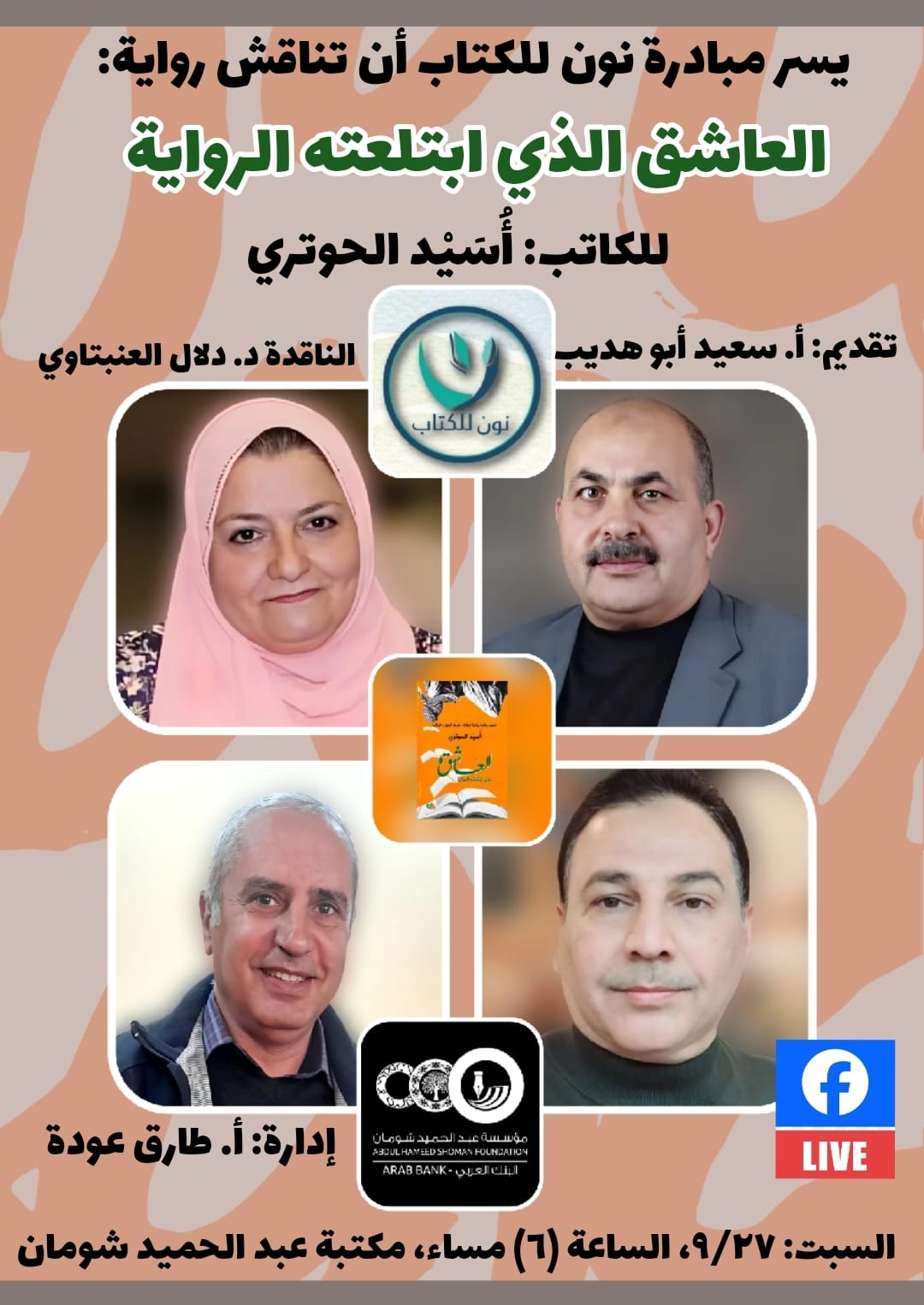 عمون - تعقد مبادرة نون للكتاب يوم السبت الموافق السابع والعشرين من أيلول/سبتمبر 2025 جلستها الثالثة والثلاثين في مكتبة عبد الحميد شومان بجبل عمّان، حيث تستضيف الكاتب أسيد الحوتري لمناقشة روايته "العاشق الذي ابتلعته الرواية".
