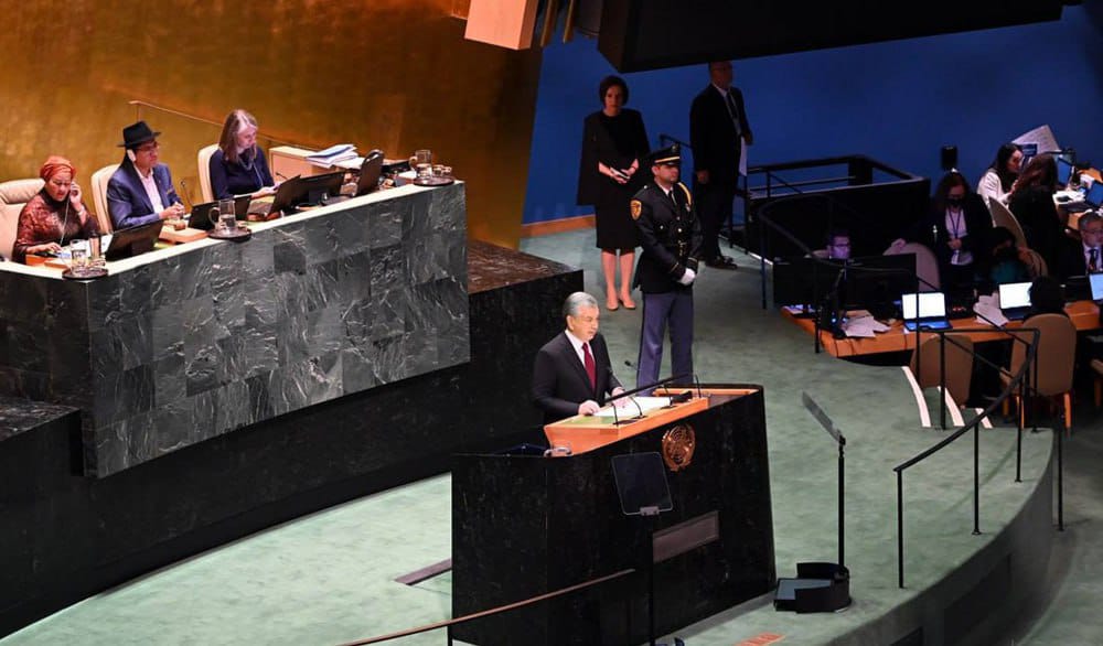 يُلقي رئيس أوزبكستان خطابات دورية في جلسات الجمعية العامة للأمم المتحدة، حيث كانت خطاباته في الدورات 72 و75 و76 و78 بمثابة بيانات سياسية هامة، تتناول قضايا مثل الأمن الإقليمي، مكافحة تغير المناخ، حماية حقوق الإنسان، وتعزيز الحوار بين الحضارات.