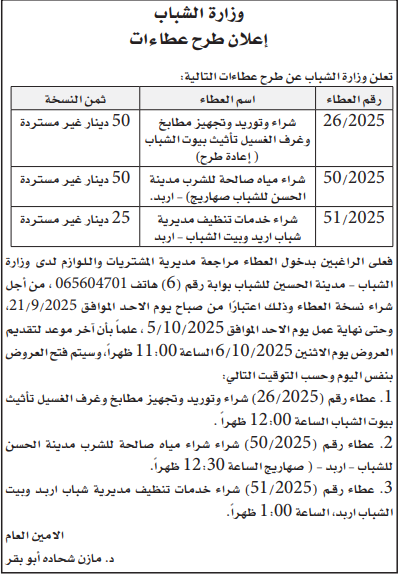 عطاءات صادرة عن وزارة الشباب