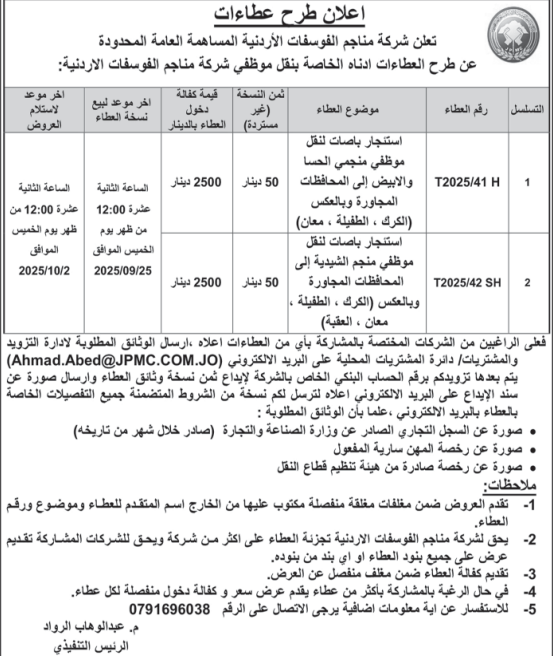 عطاءات صادرة عن شركة مناجم الفوسفات