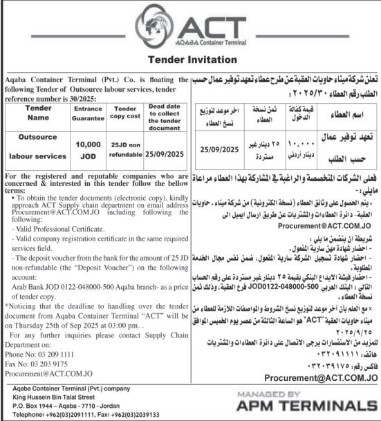 عطاء صادر عن شركة ميناء حاويات العقبة