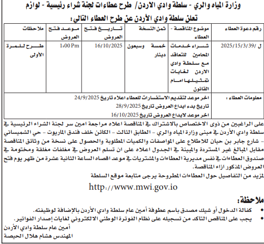 عطاء شراء خدمات المحامين للتعاقد مع سلطة وادي الاردن لتمثيلها امام القانون