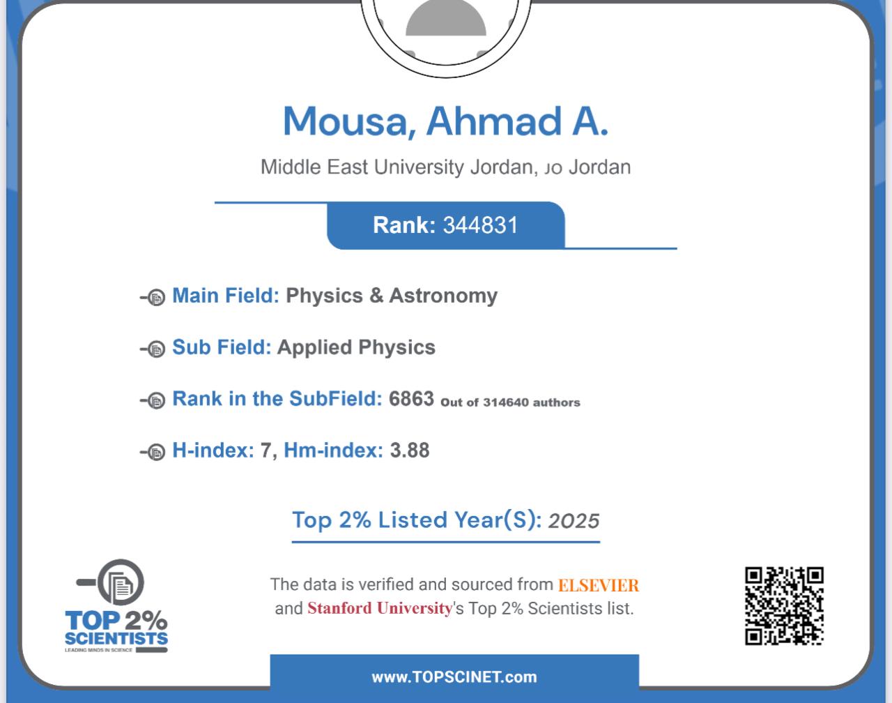 عمون - أدرجت جامعة ستانفورد الأمريكية اسم الأستاذ الدكتور احمد عبد الحي موسى - عميد البحث العلمي في جامعة الشرق الاوسط المتخصص في الفيزياء، ضمن قائمة أفضل 2% من العلماء الأكثر تأثيراً على مستوى العالم لعام 2025. |