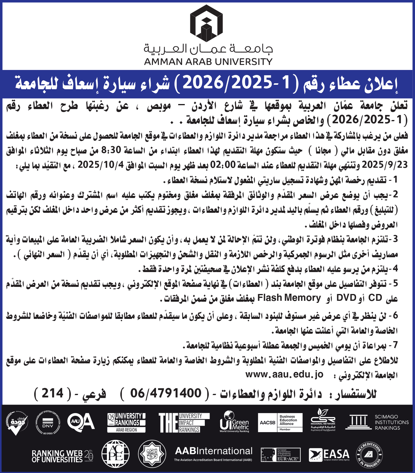 عمون - تعلن جامعة عمان العربية عن رغبتها عن طرح عطاء رقم(1-2025/2026) شراء سيارة اسعاف للجامعة