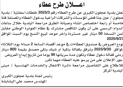 عطاء صادر عن شراء خلطات اسفلتية لشوارع بلدية عجلون