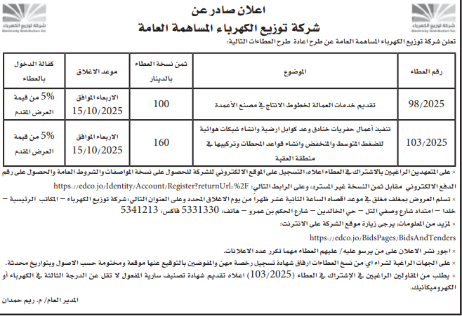 عطاءات صادرة عن شركة توزيع الكهرباء