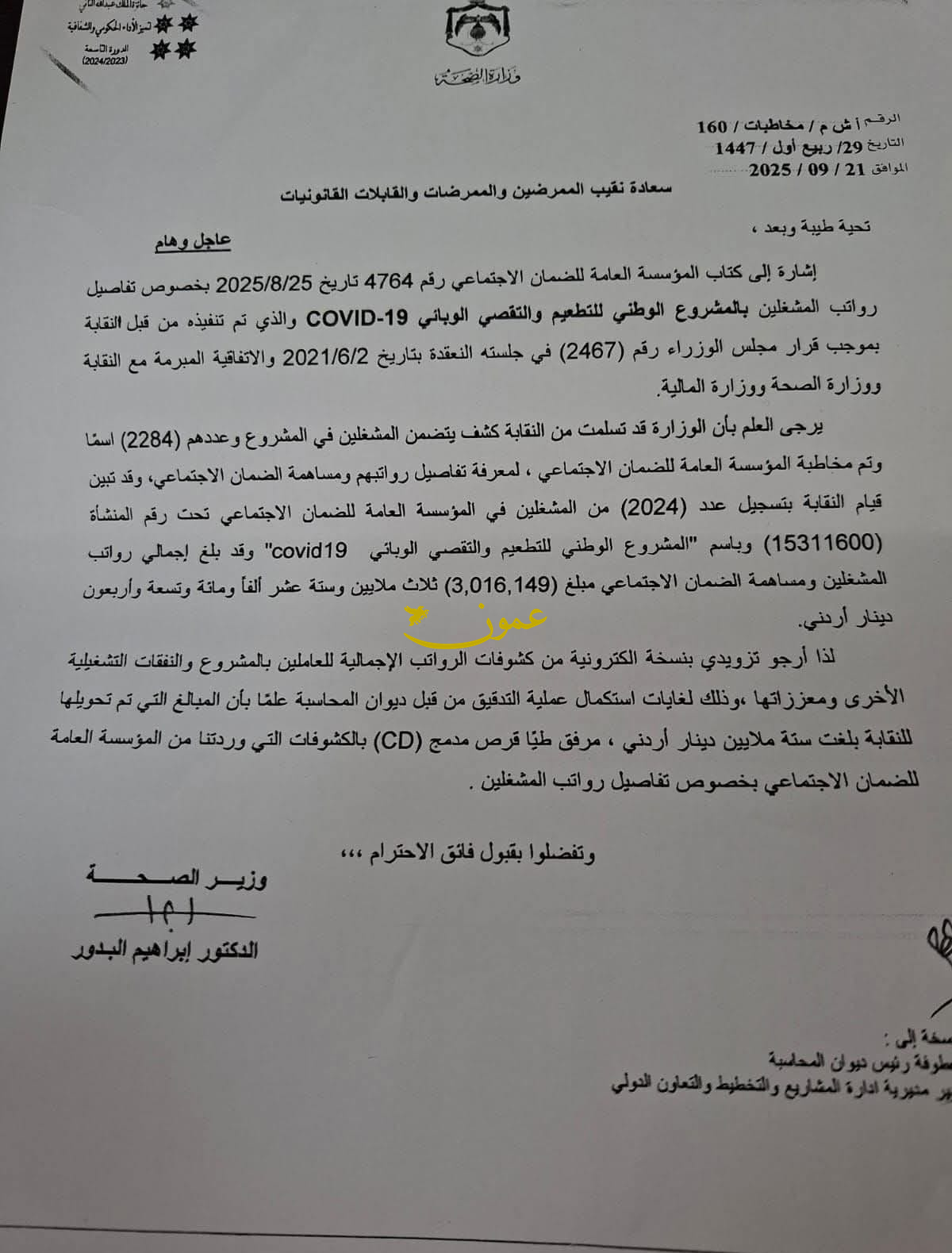 وقال البدور في كتابه الموجه للنقابة الذي اطلعت عليه عمون، إن وزارة الصحة تسلمت كشفا من النقابة تضمن المشغلين في المشروع وعددهم 2284 اسما، وتمت مخاطبة المؤسسة العامة للضمان الاجتماعي، لمعرفة تفاصيل رواتبهم ومساهمة الضمان الاجتماعي، وتبين قيام النقابة بتسجيل عدد 2024 من المشغلين في المؤسسة العامة للضمان الاجتماعي باسم المشروع الوطني للتطعيم والتقصي الوبائي covid19، وبلغ إجمالي رواتب المشغلين ومساهمة الضمان الاجتماعي ثلاثة ملايين وستة عشر ألفاً ومائة وتسعة وأربعون دينار أردني.