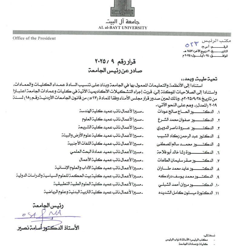 عمون - قرر رئيس جامعة آل البيت الأستاذ الدكتور أسامة نصير، إجراء تشكيلات أكاديمية وإدارية بناءً على تنسيب عمداء الكليات في الجامعة.
